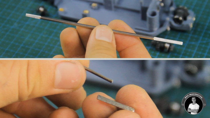With the help of a bench vise, let’s cut these marked pieces of steel to end up with the 3 sections. Using a file, we’ll begin completely filing down the shorter ones into halves followed by marking the ends of the longer rod and filing them down halfway so the flat ends match the lengths of the front and rear pinion gears.